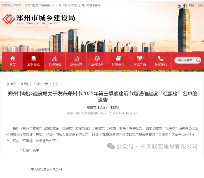 郑州市城乡建设局正式发布了2025年第三季度建筑市场诚信建设“红黑榜”名单。其中,中天骏宏建设有限公司成功入选诚信“红榜”!